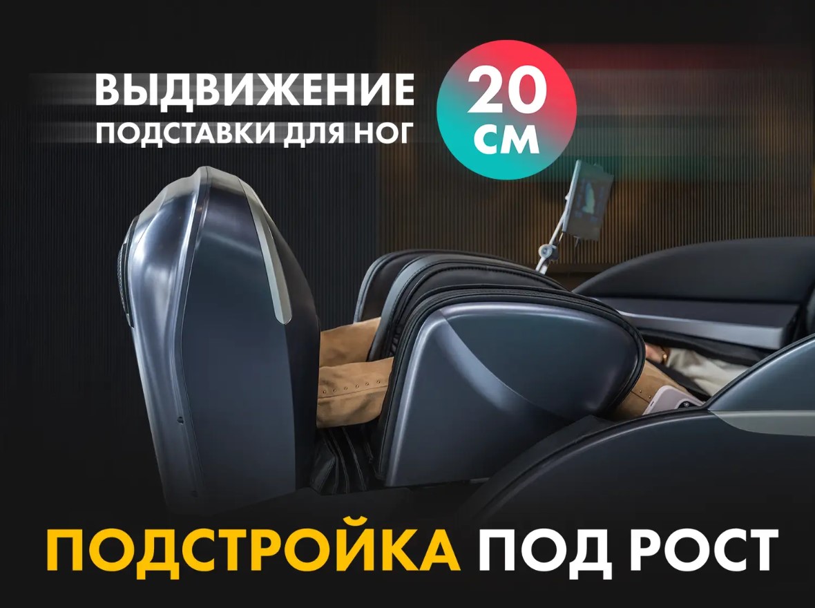 Вытягивание позвоночника- это автоматическая программа, во время которой кресло складывается, массажные подушки бережно захватывают голеностоп, плечи и руки, кресло выполняет потягивающие движения, при этом совершая роликовый массаж вдоль позвоночника., Запоминание программ - при ручной настройке массажных функций, их можно сохранить в компьютере кресла., Музыка - подключение к креслу по Bluetoth для прослушивания Вашей любой музыки во время массажа., Невесомость (Zero-G) - кресло принимает положение, при котором ноги находятся выше уровня головы. При таком положении происходит максимальное расслабление и прорабатывание более глубоких тканей роликовым массажем., Прогревание - с помощью инфракрасного прогрева происходит расслабление мышечных тканей, за счёт чего массаж становится ещё более эффективен., Раскачивание - во время массажа, кресло совершает плавные покачивающие движения., Регулировка под рост - с помощью этой функции кресло подойдёт людям с разным ростом., Светотерапия - основанна на применении световых лучей как имитации солнечного света., Сканирование - перед началом сеанса, кресло выявляет отличительные особенности пользователя и проблемные зоны., Слайдер - благодаря данной функции устройство можно ставить практически вплотную к стене и не беспокоиться, что при начале массажа, спинка кресла упрётся в стенку., Управление со смартфона - скачиваете приложение и управляете креслом прямо с телефона |
